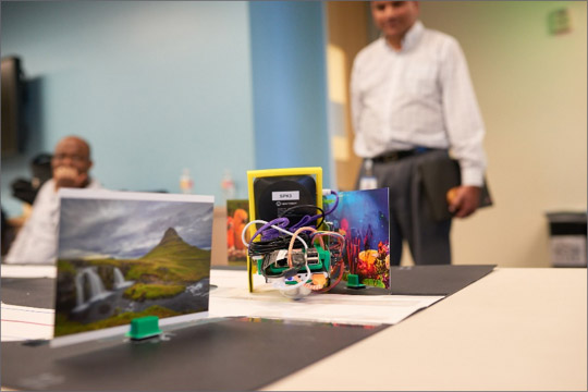 Our final exercise was a “super lab” that incorporated all the skills we had used so far. The interface was an observation bot complete with computer, camera, speaker, and motor that would traverse our game board scanning for and identifying objects as it went (i.e. Google Street View meets Big Brother).