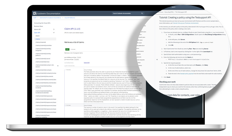 For the InsuranceSuite Cloud API, we’ve introduced new endpoints that enable integrations to interact with unverified policy claims, claim and exposure assignments, more service request flows, underwriting activities, out-of-sequence endorsements, producer codes and organizations, and product model definitions including Advanced Product Designer (APD) editions. We’ve also introduced the first publicly accessible API reference starting with the ClaimCenter API, helping developers more easily study the API, and, well, go faster.