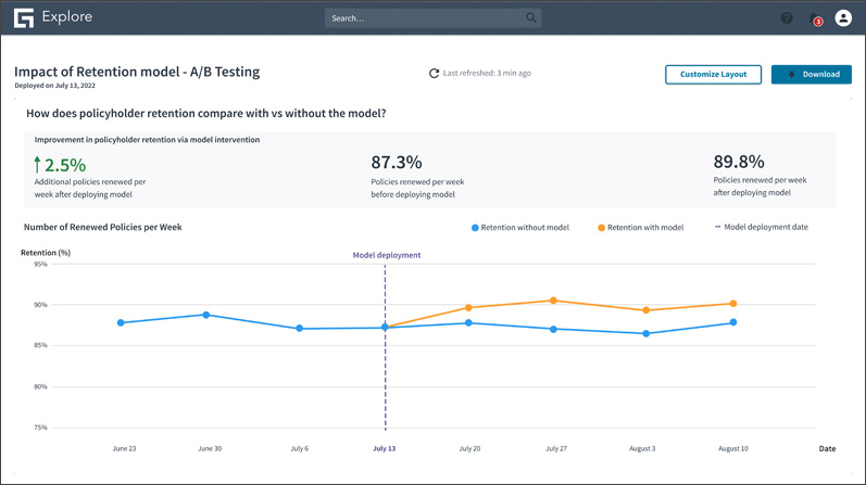 This new Solution offers a standard development process for a retention program customized to your needs and goals. Bringing together insurance, demographic, and behavioral data from your system of record from other internal and external sources, we’ll help empower your team to take a scientific approach to retention based on modeling from Guidewire Predict or your own models for retention and profitability. We’ll help you identify targets for various retention efforts and measure effectiveness in real-time via easy-to-interpret dashboards: